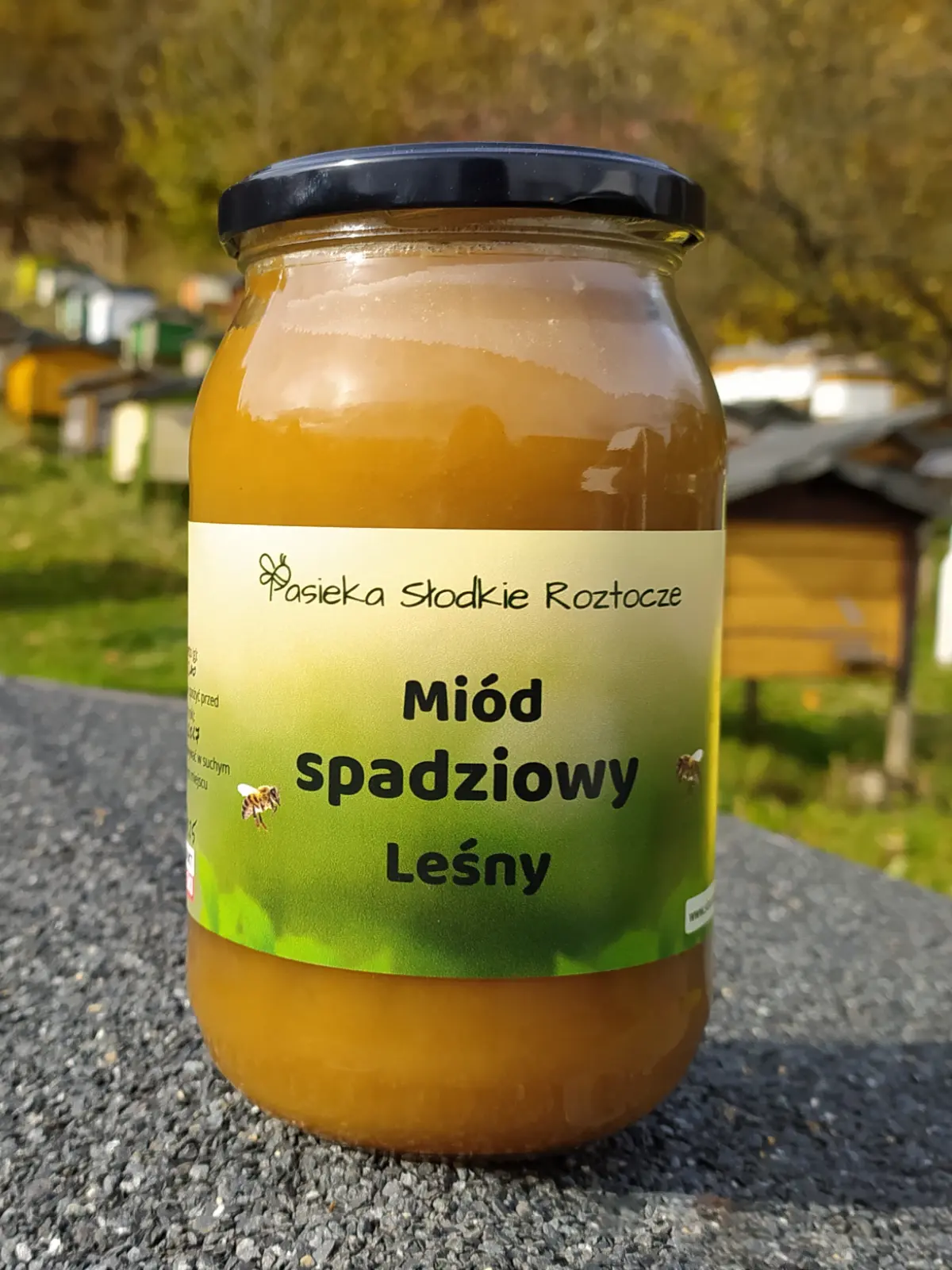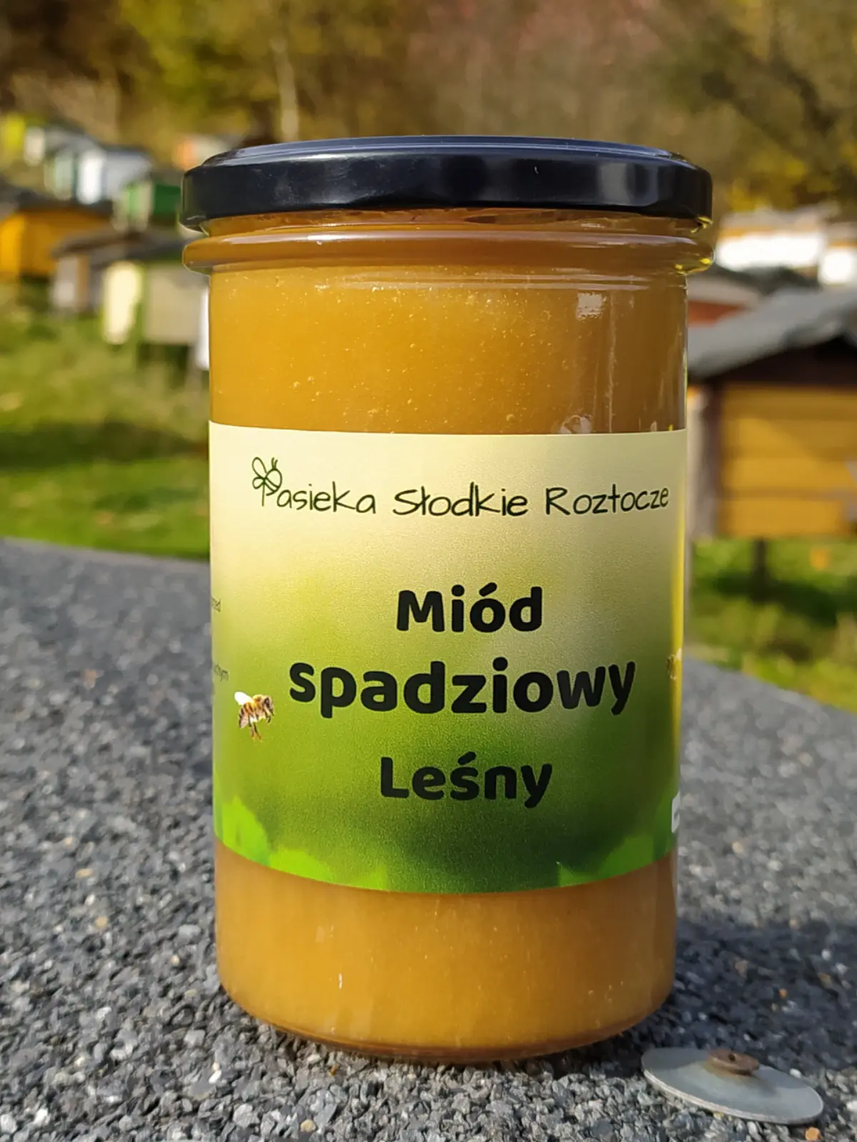 W strukturze jest naturalnie skrystalizowany, z widocznym połyskiem i drobnym „szronem” fruktozowym. Mimo głębokiego koloru pozostaje łagodny i przyjemny w smaku – inny niż miody z terenów otwartych, co czuć już przy pierwszej łyżeczce.