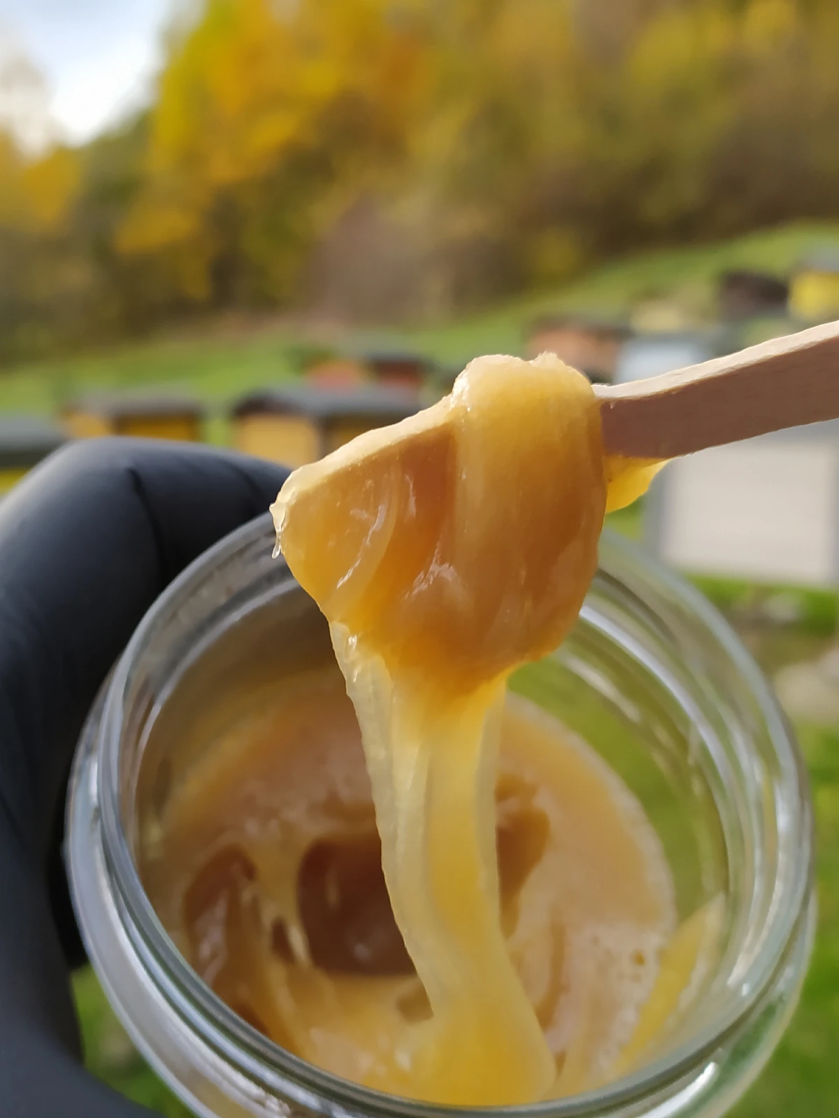 Wyniki badania, w połączeniu z przewodnością 928 µS/cm, jednoznacznie klasyfikują ten miód jako spadziowy liściasty. To miód o spokojnym charakterze – czysty, naturalny i pełen leśnego klimatu, w którym zamknięta jest historia naszej nowej pasieki.