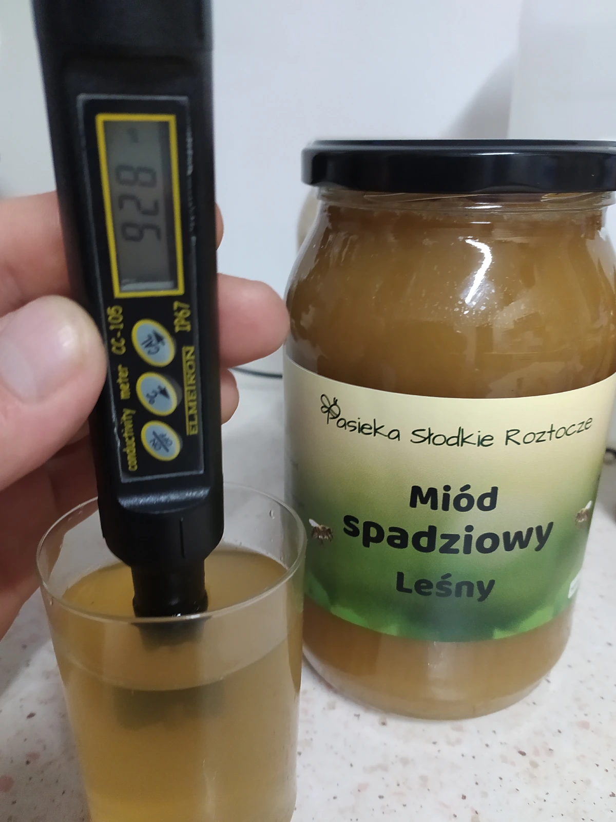 Przewodność elektryczna na poziomie 928 µS/cm wskazuje, że jest to miód spadziowy liściasty – rzadki w naszym regionie i bardzo ceniony przez koneserów. To pierwszy miód z naszej nowej pasieki leśnej, w którym widać i czuć potencjał tego miejsca.